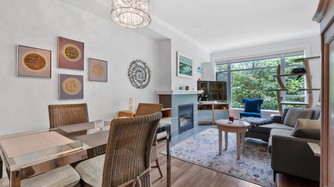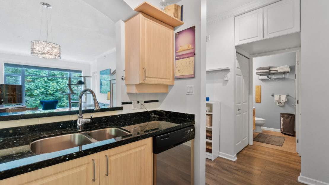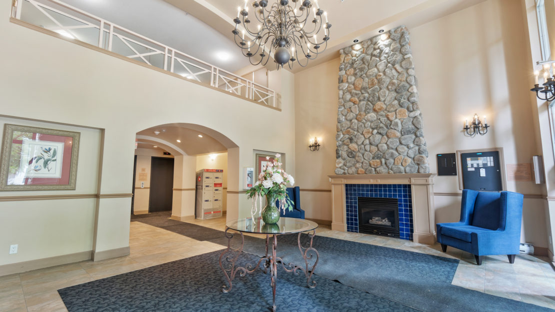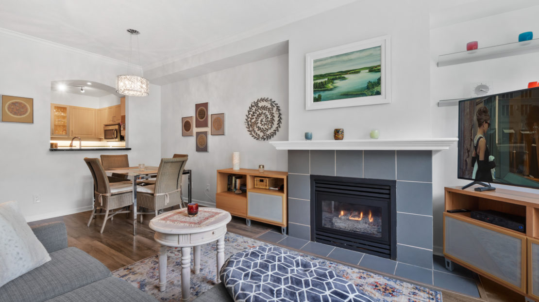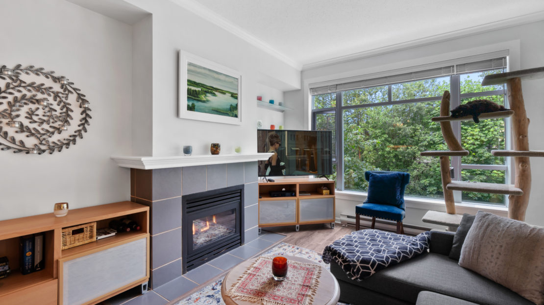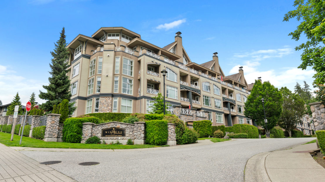 Meticulously cared for spacious one bedroom home, in the concrete Winding building. Located in the highly coveted and growing Raven Woods Community. Quiet North facing exposure over-looking green space with a well appointed floor plan, 9’ cielings, laminate flooring, S/S appliances and gas fireplace. The bedroom is an ample size, with plenty of room for additional wardrobes, and includes sliders to the North facing balcony. Take advantage of true North Shore living with access to all the local trails, Cates Park, Mount Seymour and walking distance to Parkgate Mall. 1 Parking & 1 Storage included.